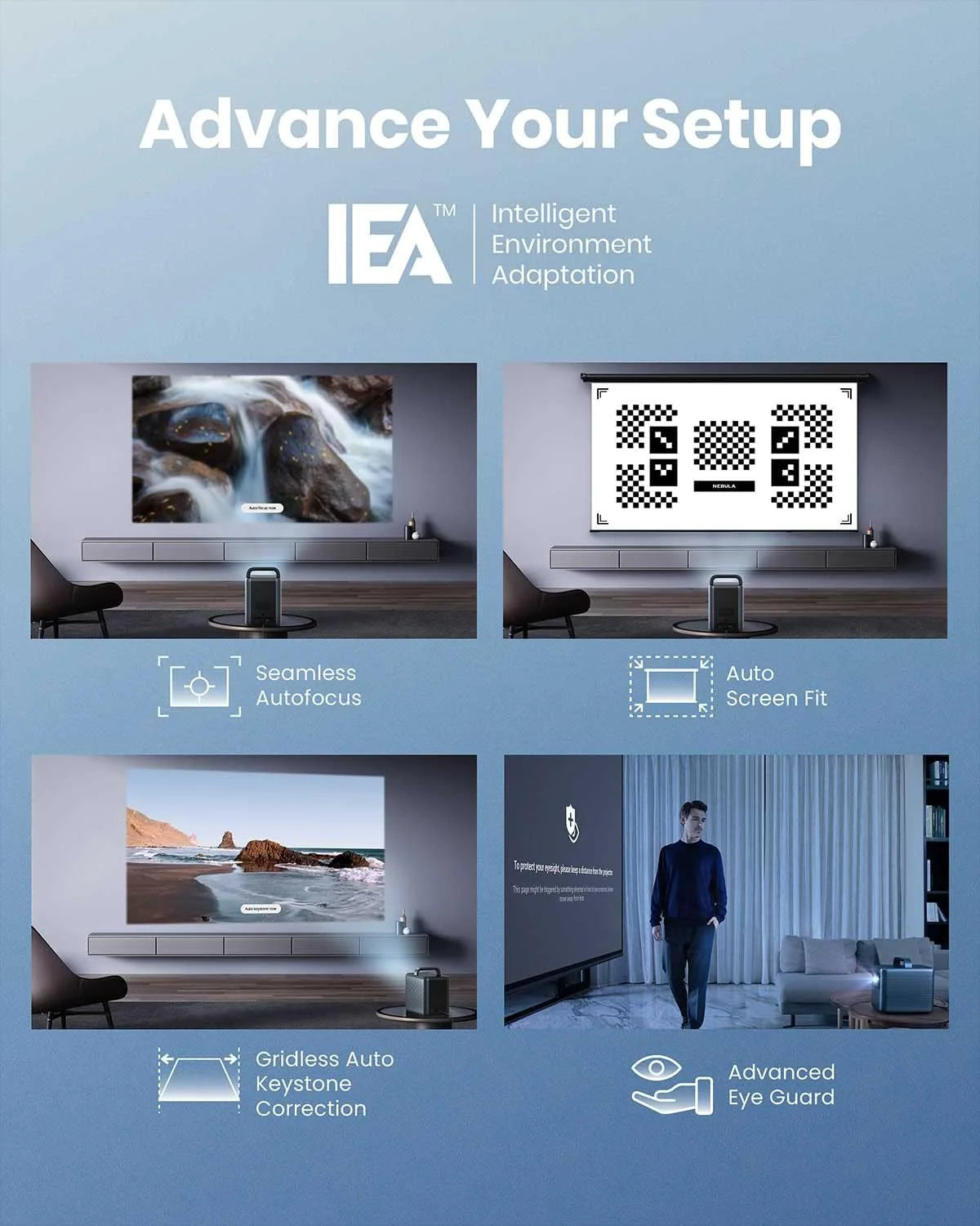 - Setup is a Snap - Start the movie in seconds with Intelligent Environment Adaptation (IEA) Technology. Analyze your room to avoid furniture or decorations, then watch your screen automatically fit to your space without any disruptions to the action on screen.