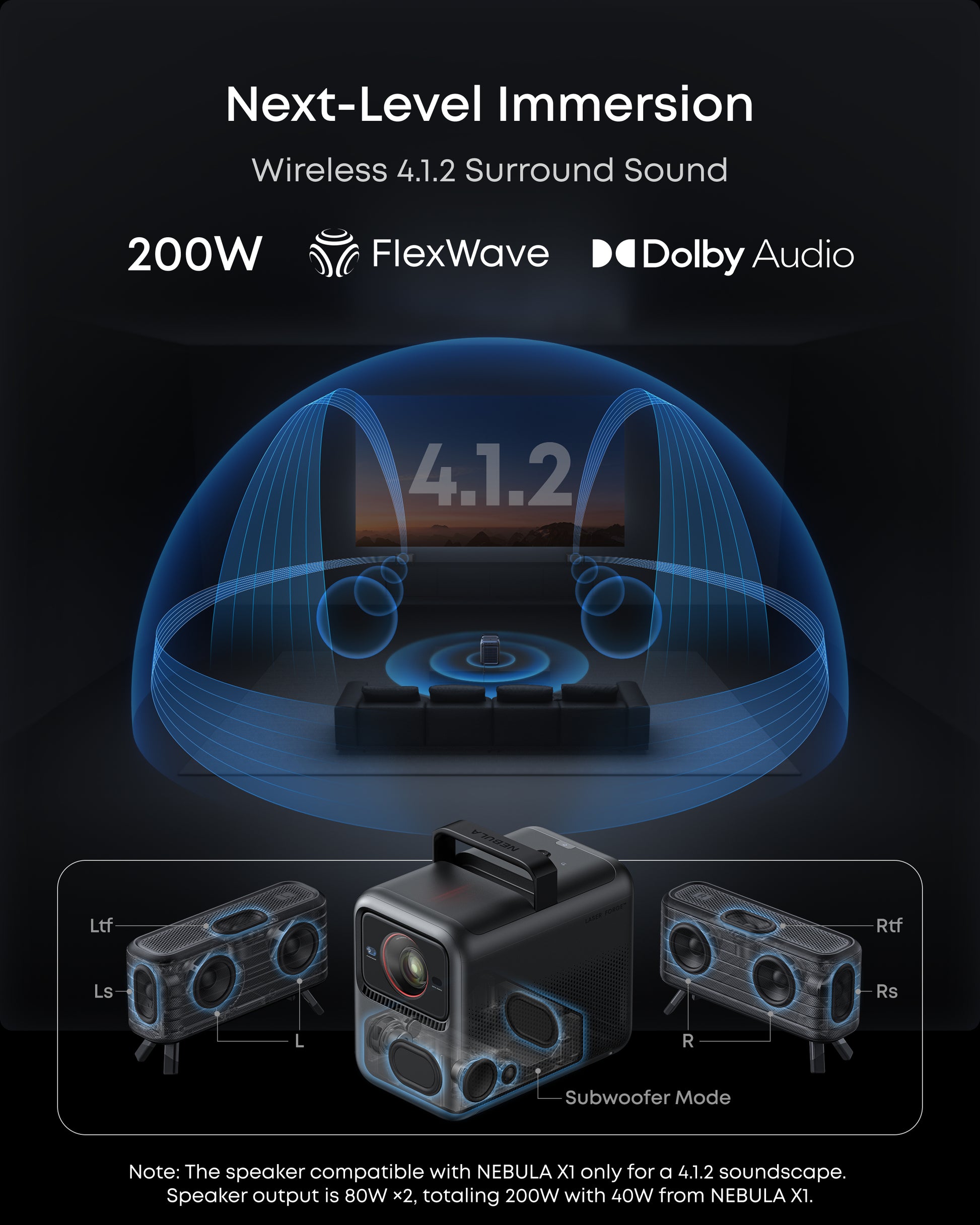- 4.1.2 Surround Sound with Wireless Satellite Speakers: Connect the wireless satellite speakers to NEBULA X1 for an extra 160W output, delivering an immersive surround sound experience.