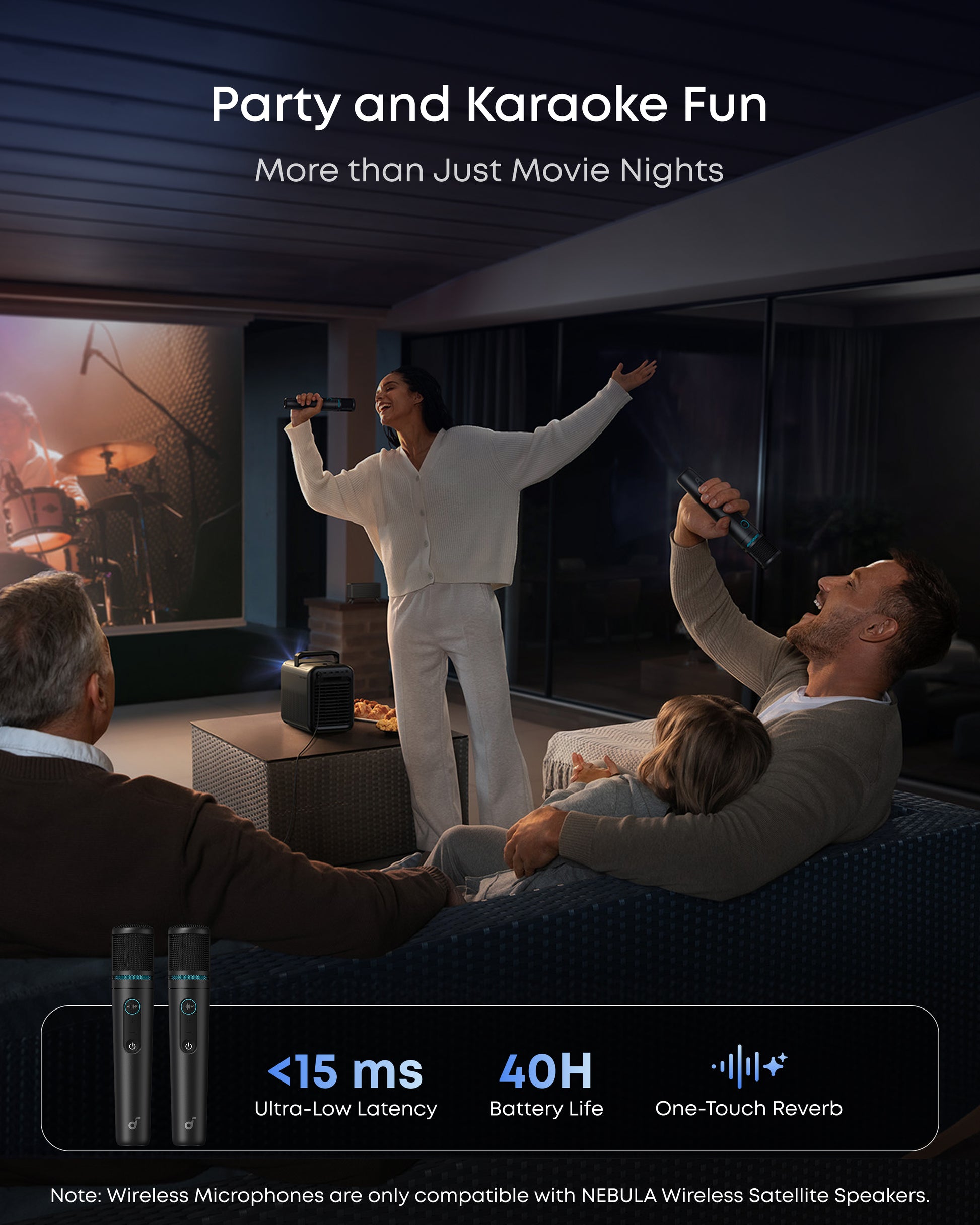 - Portable All-in-One Entertainment Kit: The Accessory Pack includes two wireless satellite speakers, two wireless microphones, and a carry case-paired with NEBULA X1 for a premium entertainment experience.